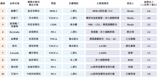 中国十大畅销抗体药(来源:弗若斯特沙利文、招股书)