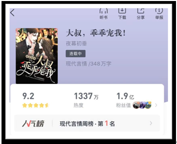 另一方面,短剧也可以作为IP长视频影视改编的先导调研,这是IP泛娱乐闭环上重要的节点,已成为了内容公司的兵家必争之地。米读创造性地将连载中的小说和改编短剧并行推出,米读平台上热度登顶的《大叔乖乖宠我》在连载过程中,就开始开发IP,小说、短剧联合推广,互相引流,互为补充,为旗下IP构建了流转、增值的生态版图。