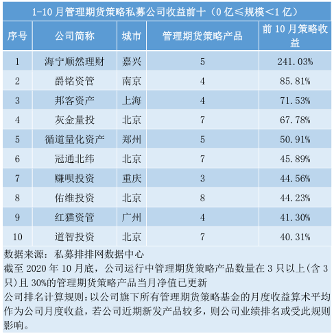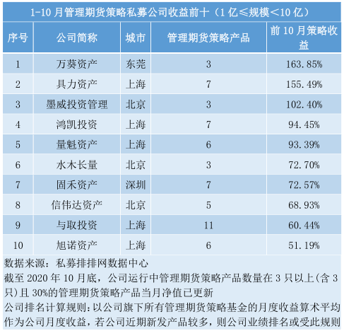 本着公平、公正的原则,私募排排网为广大投资人提供一份不同规模私募榜单,参考私募机构管理规模,将私募机构划分为50亿以上、20-50亿、10-20亿、1-10亿、0-1亿五大类别,筛选出旗下运行的管理期货策略产品数量在3只以上(含3只),且3只以上(含3只)产品当月净值已更新的私募机构,按今年以来的策略收益率排序,制定出不同规模管理期货私募机构十强榜单。