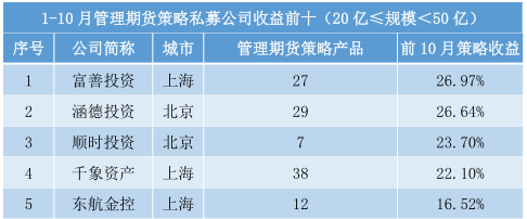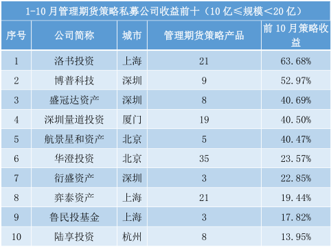 富善投资业绩夺魁,成为1-10月20亿≤规模<50亿管理期货策略私募公司收益榜单冠军,涵德投资以0.33%的收益差屈居榜单第二,顺时投资、千象资产、东航金控也均上榜前五。