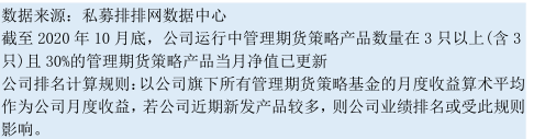 需要注意的是,公司排名计算规则以公司旗下所有管理期货策略基金的月度收益算术平均作为公司月度收益,若公司近期新发产品较多,则公司业绩排名或受此规则影响。