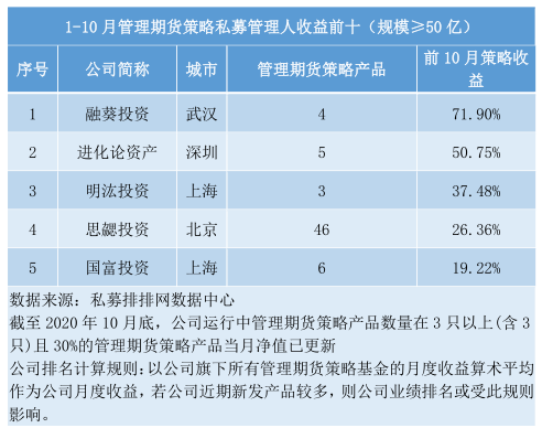 融葵投资、进化论资产、明汯投资、思勰投资、国富投资分别获得规模50亿以上管理期货策略私募前五。