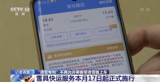总台央广记者在12306客户端上购买了一张11月24日北京北到太子城的高铁票。在支付后,订单信息页面出现了是否需要办理雪具快运服务的提示。提示显示,记者购票的车次为滑雪旅游专线,为确保旅客在旅途中有舒适的乘坐环境,自2020年11月17日起,旅客不得随身携带长宽高之和大于130厘米的雪具乘车。如果旅客需要携带超过以上标准的雪橇、滑雪板、登山装等雪具或装备乘车,则需要购买雪具快运服务。