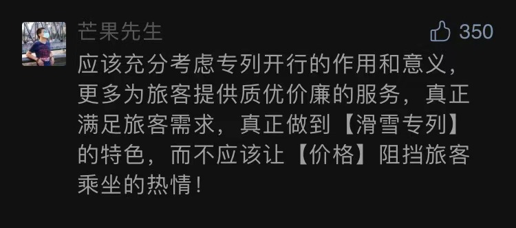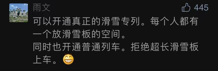 也有网友提出,毕竟是“滑雪专列”,应该考虑滑雪爱好者的需求,设计更加科学的车厢空间,出台更加合理的携带规定。