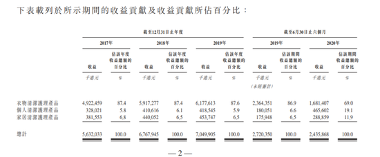 公司是中国领先的以消费者为核心的家庭清洁护理公司,研发、生产及销售多款产品,涵盖衣物清洁护理、个人清洁护理及家居清洁护理三大品类。根据弗若斯特沙利文报告,于2017年、2018年及2019年各年,公司的洗衣液、洗手液及浓缩洗衣液产品在其各自市场的市场份额均排名第一。