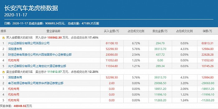 盘后公布的龙虎榜数据显示,前一个交易日以高达2.29亿元的买入额高居长安汽车买方榜首的知名游资方新侠常用席位兴业证券陕西分公司,11月17日再次现身该股3日龙虎榜买方首位,买入金额高达6.11亿元。