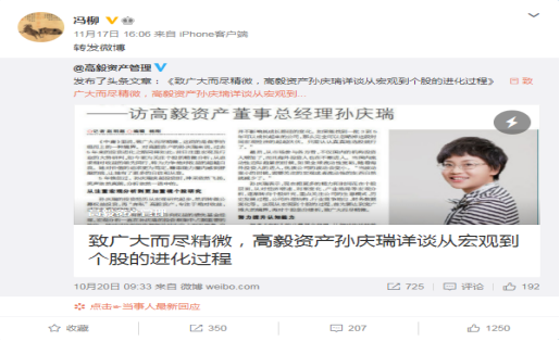 身处舆论中心的高毅,自然也不会坐以待毙。首先是焦点人物冯柳,在微博转发了题为《致广大而尽精微,高毅资产孙庆瑞详谈从宏观到个股的进化过程》的专访,被市场视为间接辟谣。