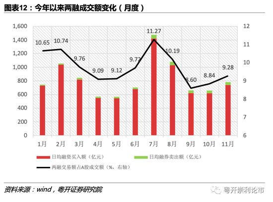 截至11月13日,融资买入额7397.98亿元,日均融资买入739.80亿元,较上月环比上升19.60亿元;融券卖出414.75亿元,日均融券卖出41.47亿元,较上月环比上升3.30亿元。两融交易占A股成交额9.28%,两融融资有所增加。