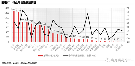 从行业分布来看,电子、计算机、电气设备、医药生物、银行板块解禁压力最大,解禁市值分别为1274亿元、1252亿元、834亿元、824亿元、763亿元,今年以来涨跌幅分别为34.79%、13.81%、60.91%、41.93%、-5.90%。