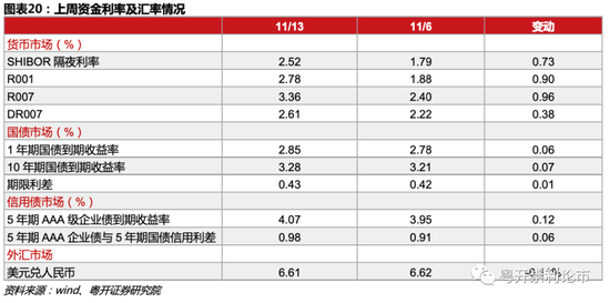 整体市场价格方面,上周货币市场、国债市场和信用债市场利率小幅上行,人民币升值。其中货币市场短端利率上行,SHIBOR隔夜利率上行73BP,R001上行90BP,R007上行96BP,DR007上行38BP;国债市场中,一年期国债收益率上行6BP至2.85%,10年期国债收益率上行7BP至3.27%,期限利差变动不大;信用债市场中,5年期AAA企业债收益率上行12BP,信用利差上行6BP。汇率方面,上周美元兑人民币汇率下行0.11%至6.61,人民币升值。