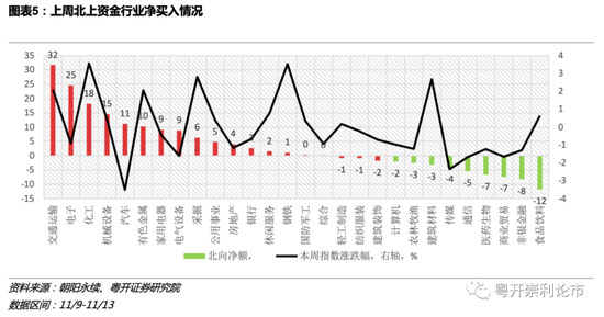 从行业来看,上周周期板块获得北上资金流入较多。上周交通运输、电子、化工、机械设备行业净流入居前,北上资金分别净流入31.75、24.58、18.14、14.50亿元;食品饮料、非银金融、商业贸易、医药生物行业净流出居前,分别净流出11.77、8.22、7.31、6.58亿元。