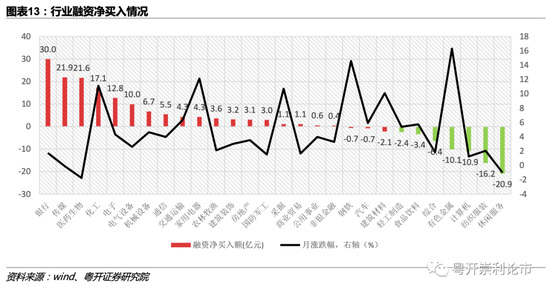 具体到行业来看,两融与北上资金偏好有所分化。本月融资净买入的行业较多,靠前的行业为银行、传媒、医药生物、化工、电子,分别为30.0、21.9、21.6、17.1、12.8亿元;融券净卖出的行业主要为休闲服务、纺织服装、计算机、有色金属及综合,分别为20.9、16.2、10.9、10.1、0.4亿元。