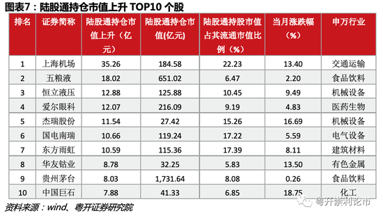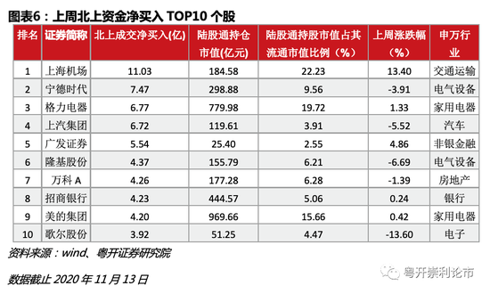 具体到个股来看,上周上海机场、宁德时代、格力电器、上汽集团、广发证券净流入居前,分别获得净流入11.03、7.47、6.77、6.72、5.54亿元;上周陆港通持仓市值上升幅度最大的个股为上海机场、五粮液、恒立液压、爱尔眼科、杰瑞股份,分别上升35.26、18.02、12.88、12.07、11.54亿元。