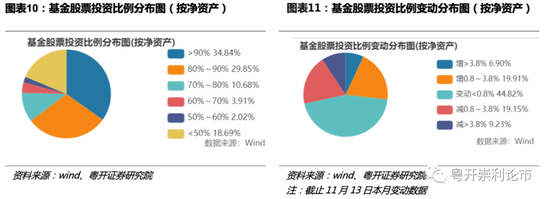 基金的股票投资比例上升,风险偏好有所回升。据WIND数据,按净资产统计,截至11月13日本月超过70%的基金股票投资比例上升。