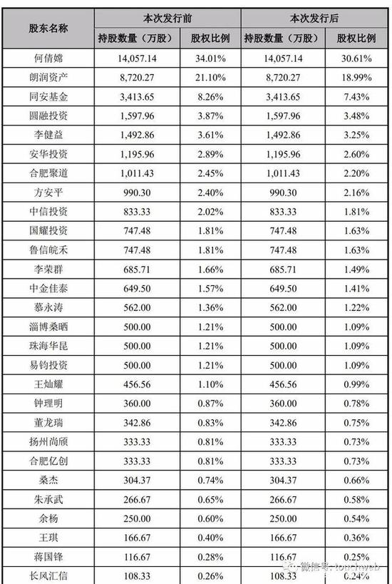 IPO后,何倩嫦持股为30.61%,朗润资产持股为18.99%,同安基金持股为7.43%,圆融投资持股为3.48%;
