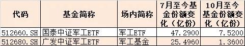 目前二级市场上有2只规模较大的军工类ETF,从7月第一波行情至今,份额都随着行情的爆发而出现了增长。