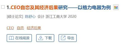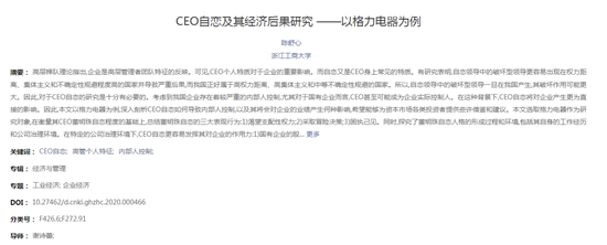 近日,浙江工商大学一篇硕士研究生论文走红网络,论文标题为《CEO 自恋及其经济后果研究——以格力电器为例》。