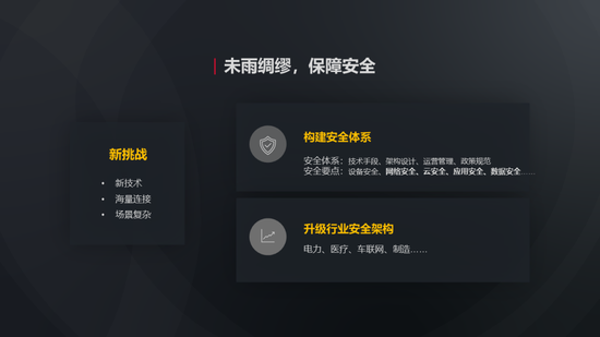 第二个建议,产业数字化要特别关注安全保障。5G+工业互联网,在加速产业数字化的同时,也面临着新的安全挑战,这来自于几个新的变化。第一个变化是新技术多,虚拟化、云化、边缘计算等大量新技术被引入进来了;第二个变化是海量的工业设备接入,种类繁多、安全能力参差不齐,这也带来了第三个变化,安全场景变得更加复杂,暴露面大幅度增加。