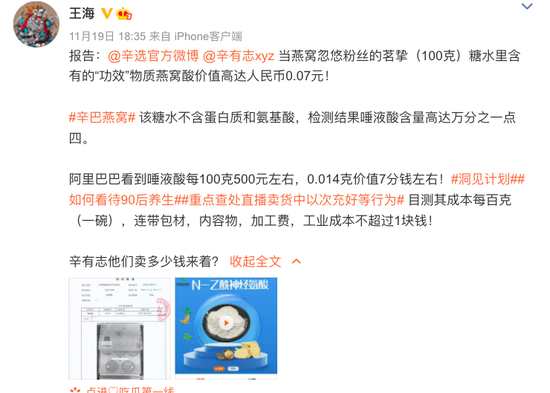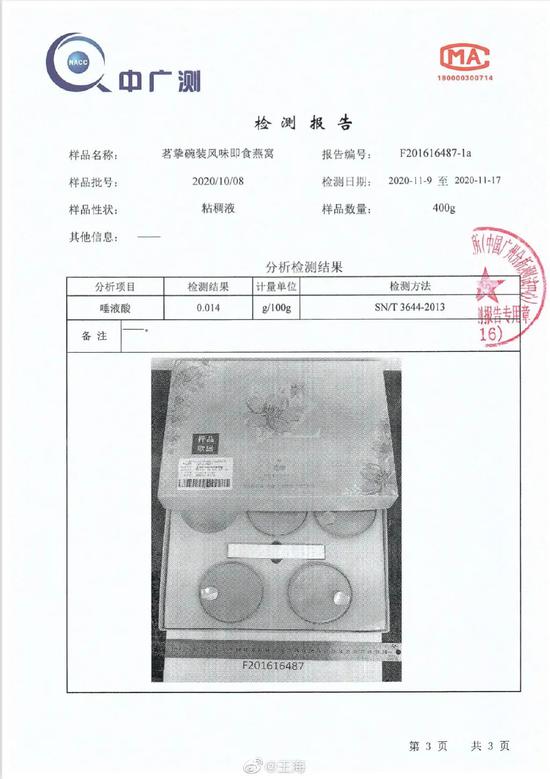 辛选官方表示,王海提供的质检报告,除了冰糖燕窝制品本身应还有的糖分外,还有燕窝成分:唾液酸。
