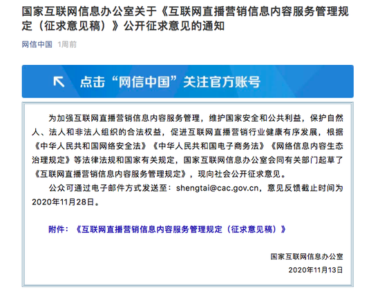 11月13日,国家网信办近日发布《互联网直播营销信息内容服务管理规定(征求意见稿)》,拟禁止直播数据流量造假、发布虚假信息等违法违规行为。