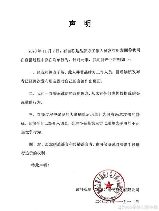对此,汪涵签约的直播机构上海银河众星电子商务有限公司11月12日发布声明称,该司从未有任何虚构数据或购买流量的行为,直播过程中爆发的大量刷单后退单行为具有恶意攻击的特征,目前平台已经介入调查,“合理怀疑是第三方以刷单为手段的不正当竞争行为”。