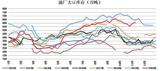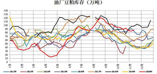 豆粕库存方面,11月中旬国内沿海油厂大豆库存在606.44万吨,豆粕库存在87.03万吨,均处于近9年同期次高水平,豆粕库存面偏空。而根据天下粮仓的船期预估后期国内大豆供应可能增加较快,天下粮仓预估2020年11月和12月预计到港大豆分别在914.9万吨和910万吨。结合海关数据,2020年1-10月我国大豆进口8321.7万吨,同比增加17.72%。如果实现天下粮仓的预估,2020年我国累计进口大豆将达到10146万吨,处于历史同期创纪录水平,关注油厂大豆的库存情况。