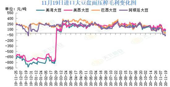 盘面榨利来看,11月19日美西11月船期对连盘油粕2101期价压榨利润105元/吨,巴西3月船期对连盘油粕2105期价压榨利润264元/吨,1月盘面榨利处于中低水平,5月盘面榨利处于中高水平,1月豆粕盘面榨利较利于做多。