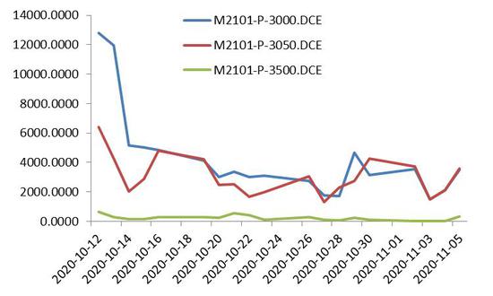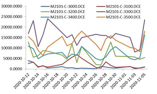 针对期权策略方面,我们主要分析M2101期货合约相对应的期权运行情况。目前挂牌的M2101期货合约相对应的不同行权价的看涨和看跌期权共50只,共25个不同档位的行权价。该期货于2020年1月16日挂牌上市,期权于次日挂牌上市。但期权成交活跃度在8月初才开始回升。M2101所对应所有行权价的看涨看跌期权交易量与持仓量以及看对应PCR展示如下: