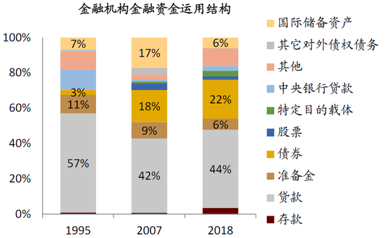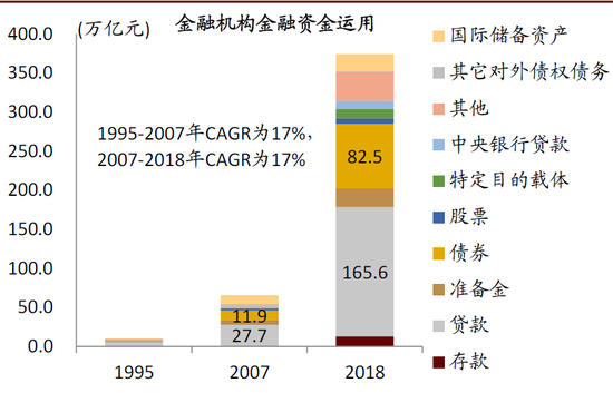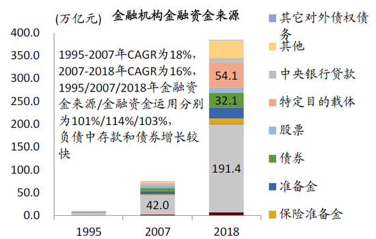 图表: 金融机构的金融资金运用中,贷款和债券投资增长较快(2007-2018CAGR后者超过前者);金融资金来源中存款占比下降,债券融资占比上升