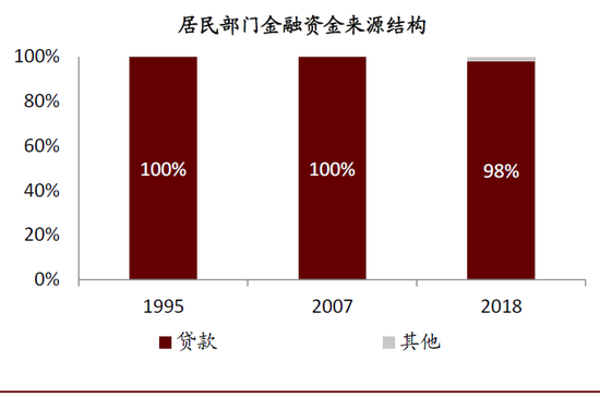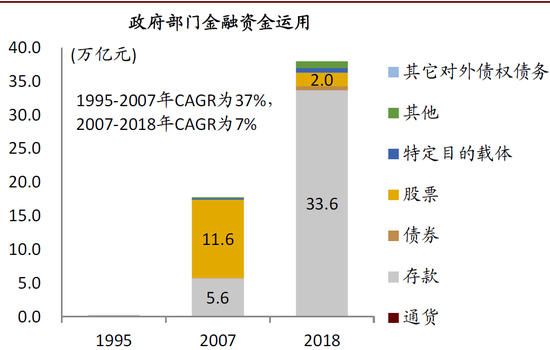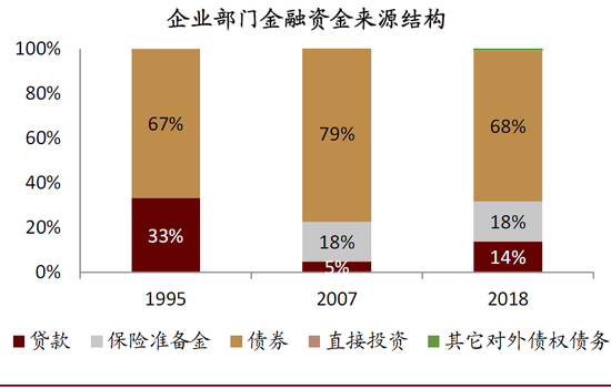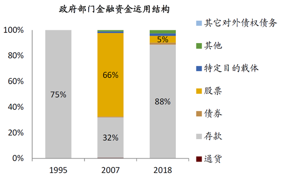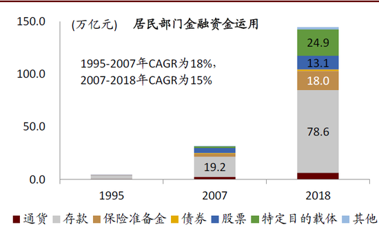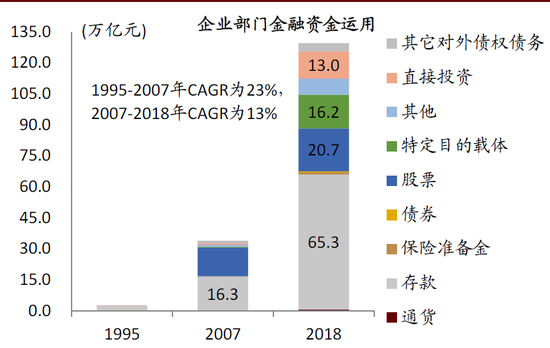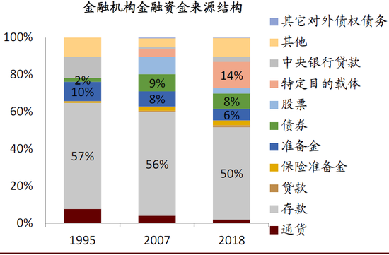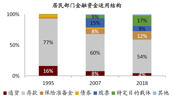 ►居民和企业部门的金融资金运用中,特定目的载体(资管产品)占比均快速提升,分别由2007年的5.3%和1.2%上升至2018年末的17.2%、12.5%。