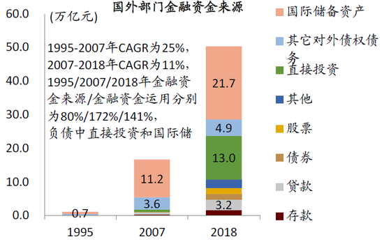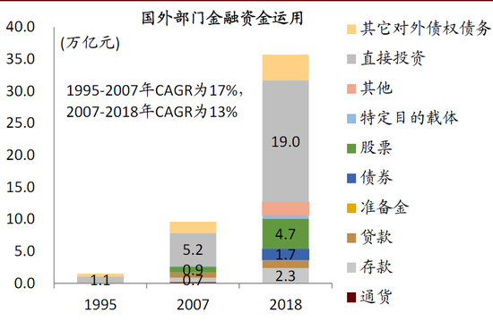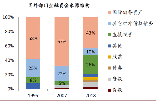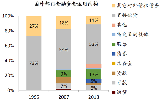 图表: 国外部门金融资金运用中直接投资占比较高,但较2007年有所下降,而股票和债券投资占比增加