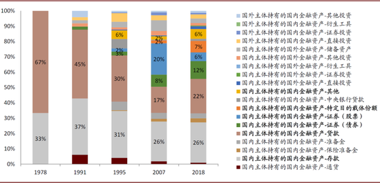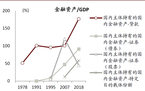 图表: 金融资产中国内主体持有的贷款、债券、特定目的载体份额(即资管产品包括理财、信托、基金)占比较高且上升明显