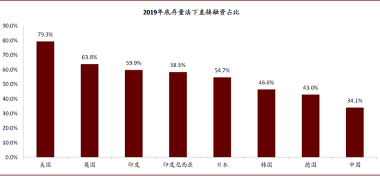 图表: 2019年底我国直接融资比重仅34.1%,不仅低于市场主导型国家美国,也低于传统的银行主导型的日本和德国