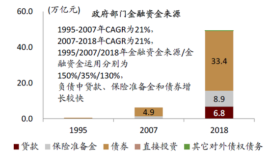 图表: 政府部门由金融资金净供给者变为净需求者;金融资金运用中股票占比下降,主要由于股权分置改革;金融资金来源中,政府债务(债券和贷款)和社保收入增长较快,未包括部分隐性债务,其中贷款近年来有所下降