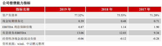 2015年开始的快速扩展阶段,导致公司债务压力大增。2017-2019年公司有息债务分别为249.65亿元、316.76亿元和315.97亿元,EBITDA利息保障倍数分别1.90、1.14和0.87,偿债压力持续加大。截至2019末,公司一年内到期的有息债务为87.08亿元,1-2年内到期的有息负债为158.31亿元,且货币资金同比大幅下降48.60%至31.84亿元,现金短期债务比由2017年的0.71持续下降至0.39,明显无法覆盖公司到期债务。