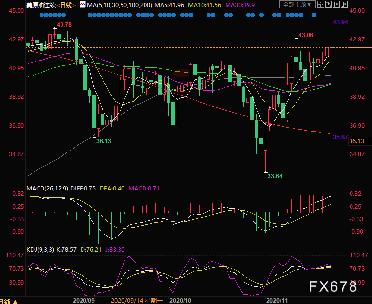上周五,辉瑞向美国食品药品监督管理局(FDA)提交了申请,要求批准其新冠候选疫苗的紧急使用授权,如果获得批准,疫苗可能会在第二天推出,疫苗极速项目负责人称希望在不到三周内启动疫苗接种。这极大地改善了市场对未来原油的需求前景。OandaCorp.的高级市场分析师EdwardMoya表示,“疫苗的最新通报对于2021年是好消息,但与此同时,病毒的扩散势头正在恶化,政府最重要的两个部门不能齐心协力,这将对市场的风险偏好构成压力。”