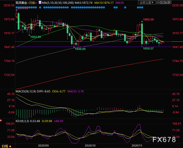 整体横盘震荡;MACD双线平行,KDJ金叉,短期黄金有上涨趋势,中长期来看,100日均线与200日均线继续上行,多头格局不变,短期均线相交紊乱,继续关注1870关口的多空争夺,同时下方1850处支撑也较为明显,短期震荡偏强。