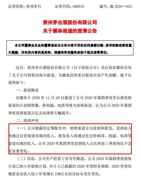 23日早间,贵州茅台发布澄清公告称,有媒体于11月20日报道了贵州茅台酒公司2020年第四季度茅台酒直销渠道的计划销售量,将商超、电商等视为直销渠道,认为贵州茅台酒公司2020年第四季度直销渠道占比及业绩将大幅提升。