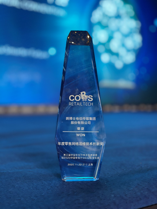 2020年11月20-21日,由CDMC决策者集团与中国零售行业CIO联盟联合主办的第三届中国零售科技决策者峰会在上海召开,鹏博士全球网络通信事业部携鹏博士 SD-WAN解决方案“PengSWAN”、“小朋管家”等产品出展了本次盛会,并在同期举行的2020中国零售行业CIO联盟年会上获得了“年度零售网络运维技术创新奖”。