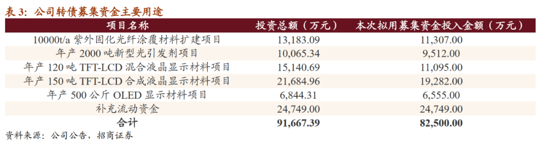 本次可转债发行规模为8.25亿元,扣除费用后用于5个新材料项目的建设以及流动资金的补充。