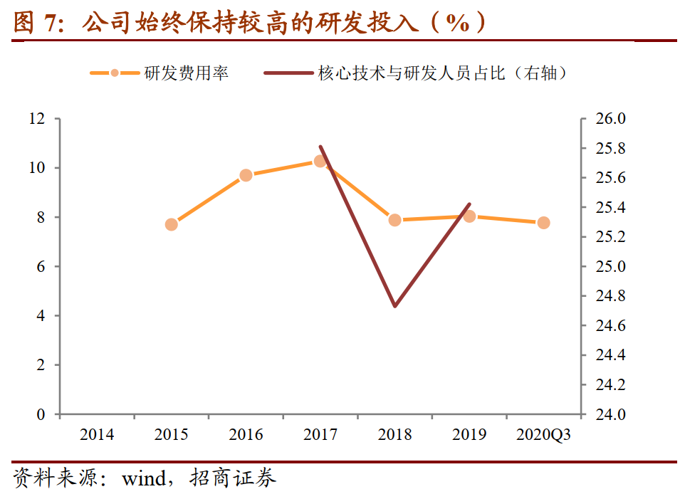 公司始终保持较高的研发投入,构建核心竞争力。紫外固化材料方面,公司已经掌握了较为先进的低聚物(合成树脂)合成技术,近三年原材料中的合成树脂自给率在30%以上,同时公司将该技术快速移植到其他应用领域如光刻胶等。公司在上海研发中心有先进的设备与材料测试能力,可为收购的几家公司的新产品领域提供研发与技术支持。公司过去几年研发投入均保持在7%以上的较高水平,研发人员与核心技术人员占比近四分之一,拥有各项专利证书超过300项。