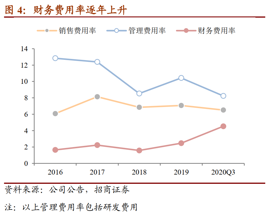 财务费用率逐年提升。近年来由于公司研发费用率逐年下降导致管理费用率呈逐年下降趋势;销售费用率则基本上持平。而值得注意的是公司财务费用率逐年上升,对公司利润造成侵蚀,近年来公司通过外延并购的方式进行扩张,同时也带来一定资金压力,今年公司再次新增融资租赁借款、导致利息支出大增。