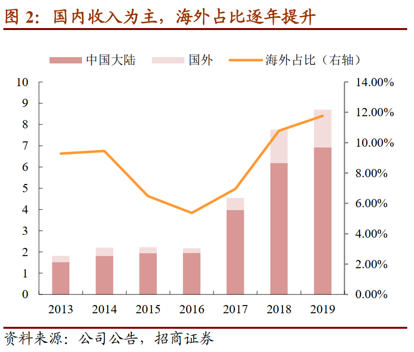 2019年公司收入15.13亿元,其中电子化学品10.28亿元、占比68%,自2017年以来该产品收入快速增长、成为公司收入增长的贡献主力;公司原有产品紫外固化光线涂敷材料收入3.95亿元,近年来收入规模相对稳定,占比逐年下滑。分地区来看,公司产品仍然以国内销售为主,2019年国内销售占比88.24%,但是国外收入占比也呈现逐年增长的态势。客户方面,2019年公司前五大客户收入占比41%,其中第一大客户收入占比12.89%,客户集中度较高。