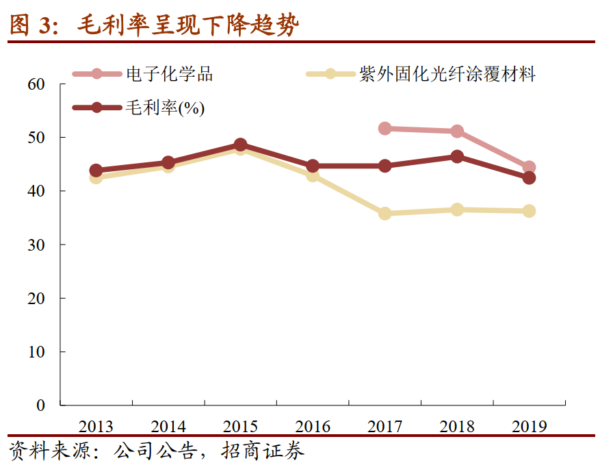 毛利率逐年下降。2019年公司综合毛利率为42.47%,近年呈现逐年向下的趋势。紫外固化材料在2017年经历价格战毛利率大幅下降,而之后由于下游光纤光缆需求低迷、价格处于相对低位,紫外固化材料价格也处于相对低位;电子化学品中的液晶材料2019年以来受下游面板行业竞争加剧与售价下降的影响,毛利率下滑明显、带动板块毛利率下滑。整体上由于公司的主要下游光纤光缆与面板LCD行业竞争激烈、需求呈现疲软,材料价格下降、导致毛利率出现下滑。