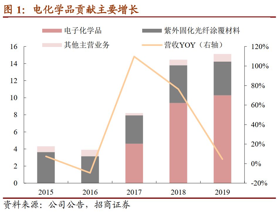 2017年公司收购和成显示(液晶材料生产商)100%股权、大瑞科技100%(主要生产半导体封装用的锡球)股权、惠州飞凯100%股权和长兴昆电60%(主要生产用于半导体、集成电路封装的环氧塑封料)股权,进入电子化学品领域,电子化学材料主要包括混晶和半导体材料,其中混晶产品为应用于液晶显示面板制造领域的 TN/STN 型混合液晶、TFT 型混合液晶,主要由子公司和成显示从事生产,客户覆盖京东方、TCL华星光电、中电熊猫等国内主流的面板生产企业;半导体材料主要为湿制程电子化学品以及应用于集成电路封装领域的锡球、环氧塑封料等。到2019年末,公司混晶产能100吨。