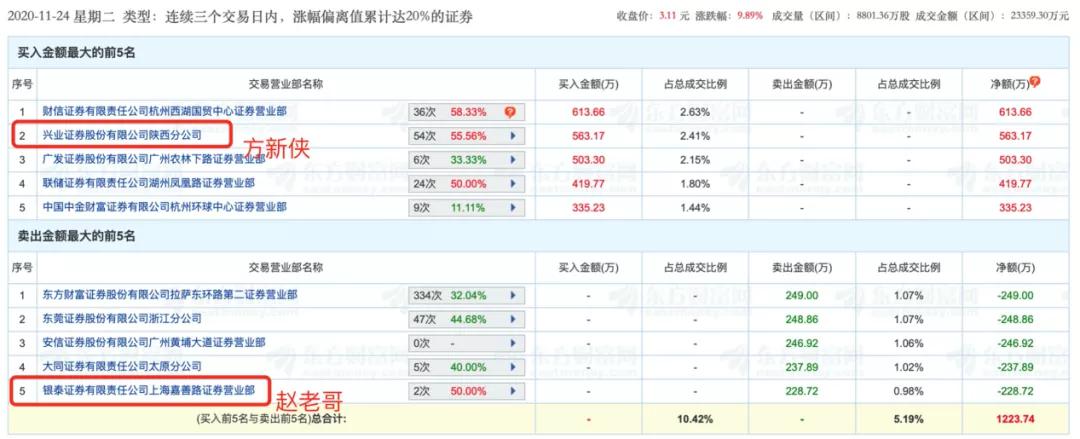 凌厉的走势也让郑州煤电频上龙虎榜。网友细扒龙虎榜发现,市场普遍认为的知名游资方新侠、赵老哥的交易席位也现身其中。11月20日至11月24日之间,方新侠的交易席位以563.17万元的买入金额,位列龙虎榜买入席位第二位;赵老哥的席位则卖出228.72万元。