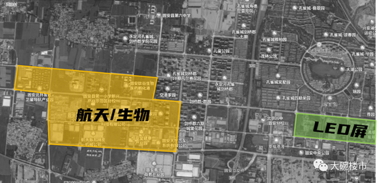 固安新城的产业,主要聚集在孔雀城的南部和西部。