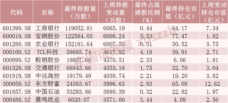 北向资金加仓股数居前的工商银行、宝钢股份、农业银行被分别加仓6065.192万股、6008.24万股、6007.53万股,此外TCL科技、鞍钢股份、交通银行、中远海控被加仓超4000万股。