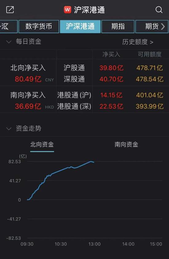 从资金面来看,Wind数据显示,截至午间收盘,北向资金净流入80.49亿元,其中沪股通资金净流入39.80亿元,深股通资金净流入40.70亿元。