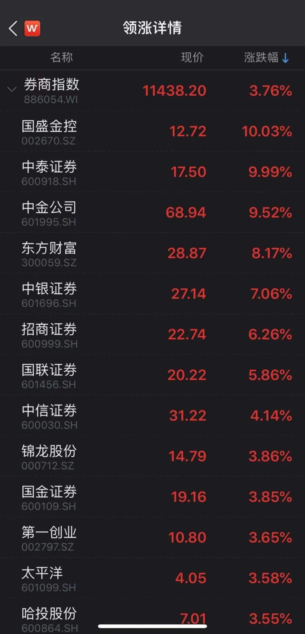 券商股爆发。截至午间收盘,Wind券商指数上涨3.76%,板块内个股全线上涨,国盛金控、中泰证券涨停,涨停板上的封单分别达13.2万手、20.9万手,中金公司涨逾9%、东方财富涨逾8%。